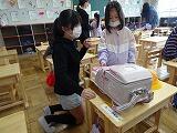 1年生が朝の支度に慣れるまで、6年生が手伝いをしています全て手伝ってあげるのではなく、1年生が自分でできることは見守っています