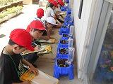 2人ペアになって協力して種を植えることができました。子どもたちは、芽が出るのが待ち遠しいようです。また、モンシロチョウの幼虫も少しずつ大きくなっています。生き物の誕生もなかなか見ることができないので、その瞬間をみんな楽しみにしています。