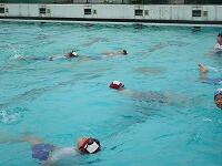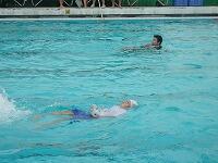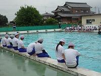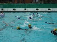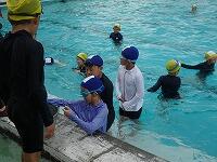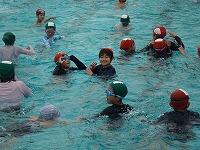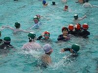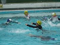 川や海に泳ぎに行った際に、いざという時に、自分で命を守らなければなりません。体操服を水着の上から着て、浮かんだり、けがをした状態を想定して泳いだりする練習を行いました。