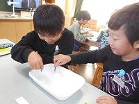 今日のめあては「じしゃくのふしぎを見つけよう」でした。一人一つずつ磁石と舟を配付され、水を汲んだ入れ物で不思議を探し始めました。「舟同士がくっついた」「針金が磁石になったの?」「磁石の力が針金に移った」子どもたちは実験しながら、次々と不思議を見つけていました。次の時間は、針金は磁石になったのか、確認するようです。子どもたちがたくさん考え、たくさん言葉を発し、楽しい授業でした。