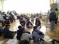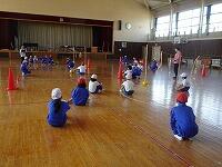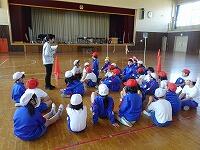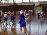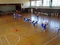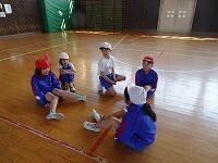 チームで協力してゲームを行いましたが、なかなか得点できません。どうすれば楽しいゲームになるか、ルールを相談しました。①コートの前の部分には入ってはいけないこと。②エンドラインだけでなく、後ろ側のサイドラインも得点とすること。③シュートを順番に行い、みんながジュートできるようにすること。みんなで相談して、いいルールができましたね。これからもっと楽しいゲームになりそうです。