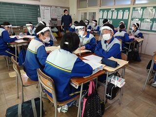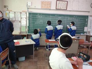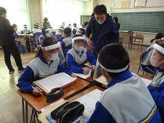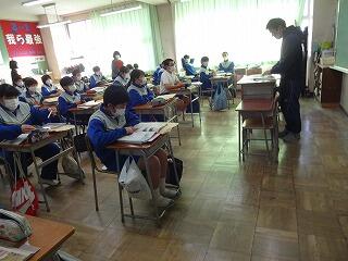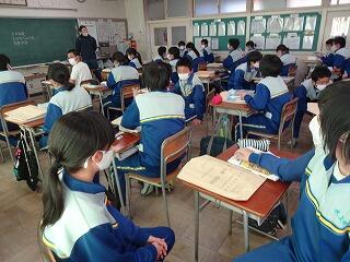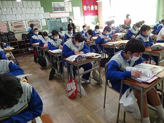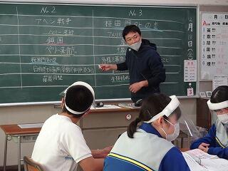 本校では、生徒の学力向上を目指して、全ての教員が1年間に1回以上、研究授業を実践しています。今回は2-1の社会(歴史分野)の授業です。