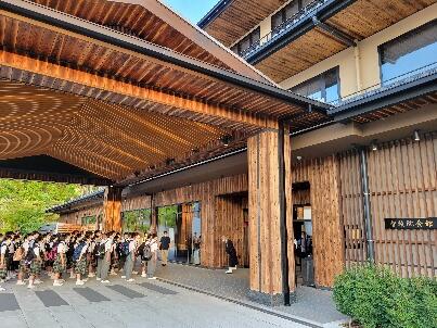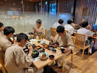 建仁寺から歩いて智積院会館へ移動。お寺のホテルだけあって、立派な木造の玄関でお坊さんがお出迎えをしてくださいました。その後、休む間もなく、またまた豪華な夕食です!明日は5時10分起床で、朝のお勤めに参加します。たくさん食べて早く寝ましょう。