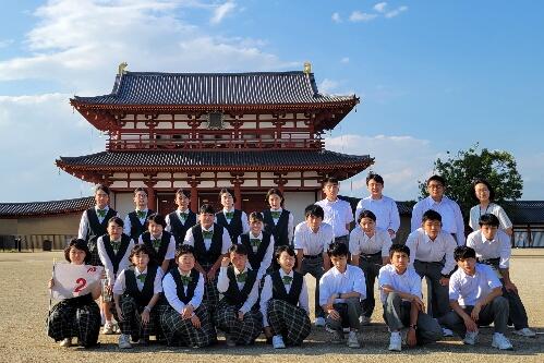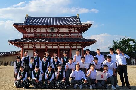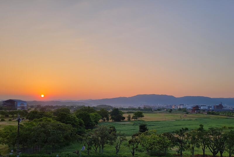 おはようございます。ホテルから見た平城京跡歴史公園です。朝5時ちょっと前に太陽が昇り始めました。クラスごとの集合写真は、昨日、朱雀門前で撮影したものです。この掲示板にも「いいね」ボタンを設定しました。ご覧になったら、ぜひ押してください。本日も1日頑張ります!
