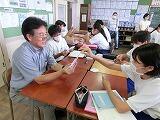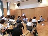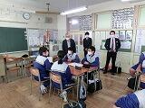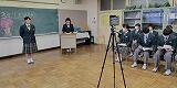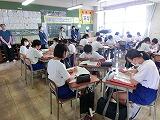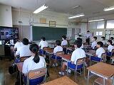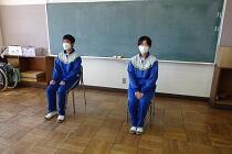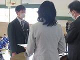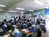 校歌を作成されるにあたり、学校の環境や生徒達の活動の様子をご覧になりたいと、皆川中、寺尾中、吹上中の3校を訪問されたのです。半﨑先生に6時間目の授業を各クラス参観いただいた後に、生徒会役員の生徒達が、どんな校歌にしてもらいたか、どんな言葉を取り入れてもらいたいかなど、半﨑先生に自分たちの思いを伝えました。