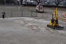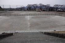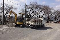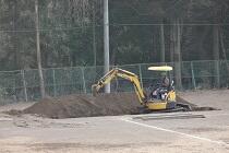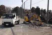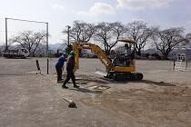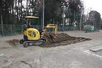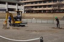 ハンドボールとテニスのコートは毎日石灰でラインを引くと、どうしてもその部分が盛り上がって凸凹ができてしまいます。それを重機を使って平らにしていただきました。また砂場の砂もだんだん土が混ざって固くなってしまっていますので、攪拌して軟らかくしていただきました。