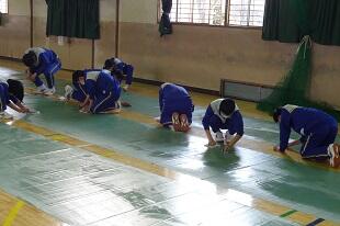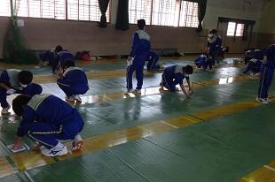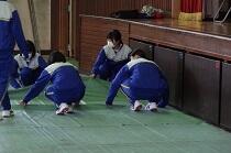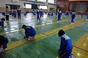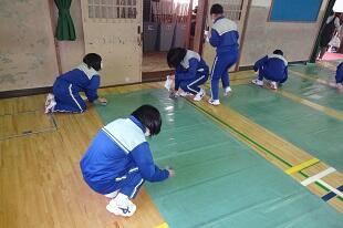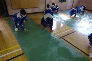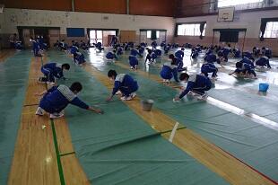 今日は準備の前の段階として、2年生が体育館の床に敷くシートをきれいにしてくれました。テープで貼った跡が黒く汚れているところを洗剤を使ってスポンジで落とし、雑巾で拭き取って見違えるようになっていました。