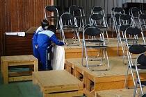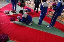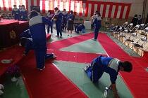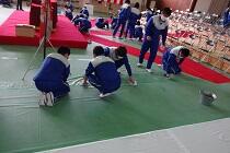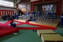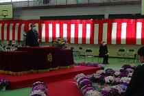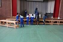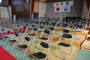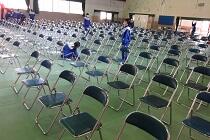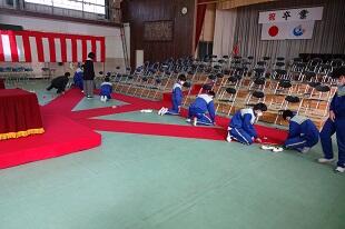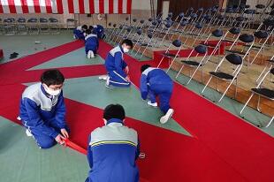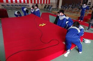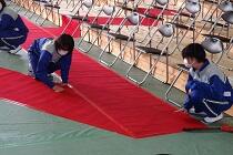 昨日式場をほぼ完成させましたが、3年生の席の横の間隔が狭かったため、1クラス3列にして横の間隔を広げ、前後も交互に並ぶようにして、すぐ前には他の生徒がいない形に修正しました。その関係で緋毛氈も位置を変えて張り直しました。