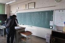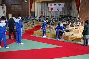 昨日2年生が在校生分の椅子の並べ替えとシート緋毛氈の掃除、そして花鉢の設置をしてくれました。一層、卒業式本番の形になってきて、間近であることを痛感しました。明後日の本番に向けて、始めて全校で練習しました。明日が予行です。1年生は本番は教室でリモートですが、今日の練習と明日の予行は参加して会場の雰囲気を味わいます。