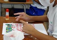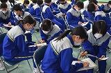 2年生は、昨年度に続いて2回目の交流会。今回は、3校の生徒たちがそれぞれ4つの教室、さらにグループに分かれての交流活動を行いました。最初に自己紹介をした後、どんな気持ちで言葉を言っているのかを想像する「はぁって言うゲーム」でアイスブレイク。次に、百人一首に挑戦しました。あまりやったことのない生徒が多かったのですが、下の句の最初の文字に集中して取り合い盛り上がりました。カードが残り少なくなると、惜しむ声も聞かれ、楽しい交流の時間となりました。