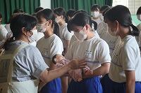 9月24日(水)5校時に、栃木市役所健康増進課の保健師の方々にご来校いただき、「考えよう性と生」という題で、思春期講演会を行いました。生命の誕生から心身の発育・発達、思春期の体の変化、多様な性の形、性感染症などの話を聞きました。実際赤ちゃんの体重と同じ重さの人形を抱いてみたり、7.2Kgの重さの妊婦体験ジャケットを身につけたりして、感想を発表しました。