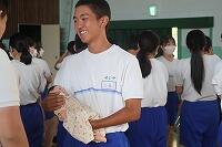 1年生は、体育館でまず、「共通点探しゲーム」を行いました。同じ部活動などの共通点のあるメンバーが声を掛け合って集まります。うまくまとまらず一つのグループになれないことも。できたグループの中で、自己紹介をしたり、朝ご飯はご飯派orパン派などさらに共通点を探したりしました。次に、メインのドッチビー。3校の生徒が交じってチーム分けしてゲームを行いました。思うように投げられない時もありましたが、盛り上がって楽しい時間を過ごすことができました。