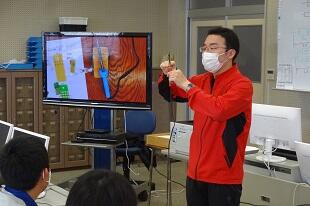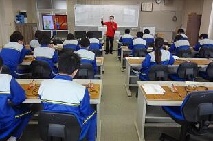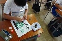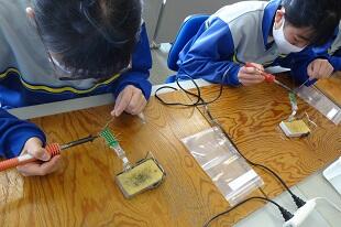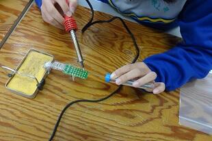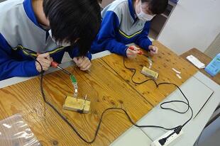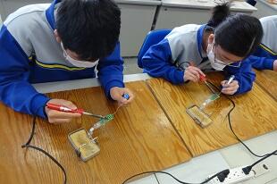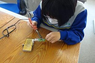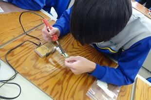 2年生が初めてハンダ鏝(ごて)を使って基盤にハンダ付けをしていました。始めは基盤に鏝(こて)を付けるのも、ハンダを付けるのも、手が震えるほど緊張していましたが、だんだん慣れてきて1回で付けられるようになってきました。
