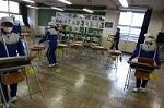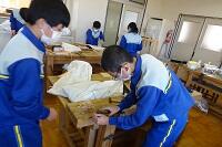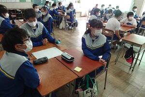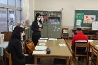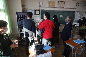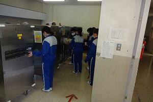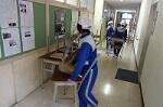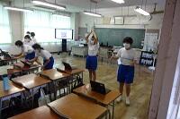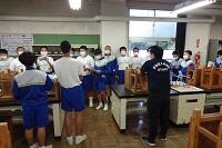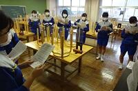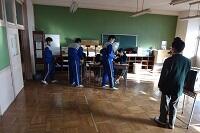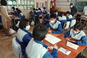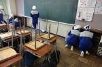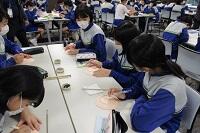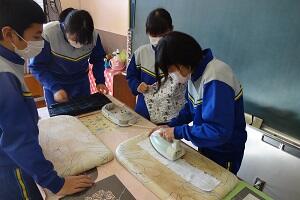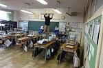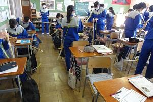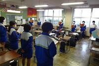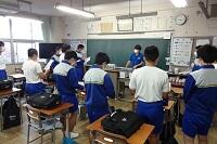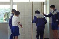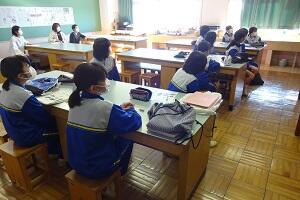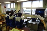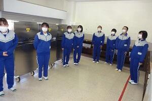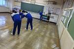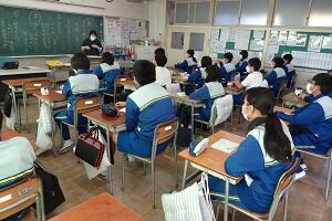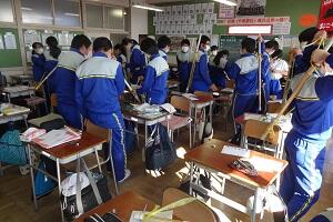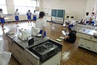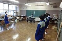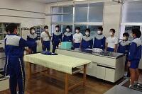新型コロナウイルス感染症のオミクロン株の感染拡大を受け、教室内の換気は授業中も15㎝ほど窓を開けて、移動教室で空いた教室は窓全開で空気を入れ換えています。そして先週金曜日から体操着(ジャージ)での登校にしました。学校内での生活も一日を通して毎日洗濯のできる体操着です。家庭科は密を避けて準備室も使っていました。