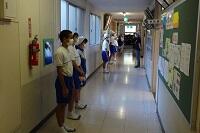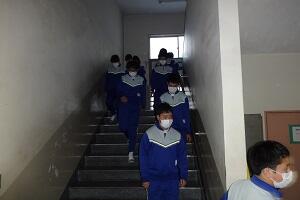 2回目の避難訓練は調理室から出火したことを想定しての避難でした。2回目の訓練ですが、授業中の想定ですので前回とは自分のいる場所も避難経路も違います。授業の教員の指示で校庭に避難しました。今回も「お・か・し・も・ち」を守って真剣に避難できました。