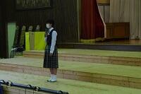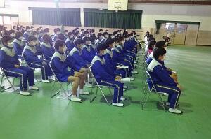 79日間の第2学期が終了しました。生徒の手指の消毒の徹底や保護者の方のご理解とご協力のお陰で、第2学期の行事はほぼ予定通りに実施することができました。学年代表で「2学期を振り返って」を発表した3人も、充実した2学期であったことが窺える内容でした。最後には今年度初めて校歌を全員で歌いました。終業式の前に先日決まった令和4年度生徒会役員の任命を行い、現生徒会長と次期生徒会長が代表であいさつをしました。その後表彰式を行いましたが、延べ21名が壇上で表彰を受け、特に今学期は作文や書道での表彰が多く、文化面での活躍が目立った学期でした。終業式後には最後に冬休み中の生活について確認をしました。