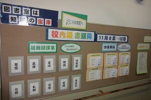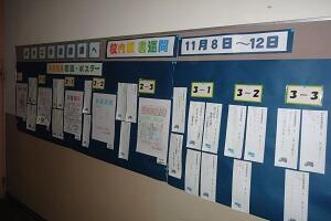 読書週間が今週11月8日(月)から12日(金)まで設定され、廊下の掲示物やお薦めの本コーナーなどを図書委員がきれいにつくってくれました。