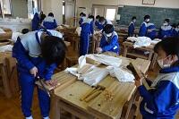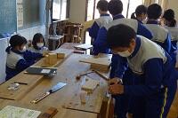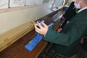 1年生の技術では木工で個人で考えた様々なものを作っています。刃を調整しながらカンナをかけていました。