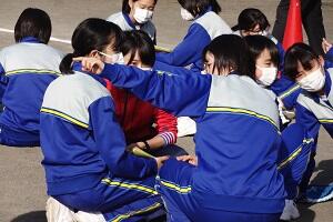時折強風で砂煙が上がる中、元気に校庭で遊んでいました。