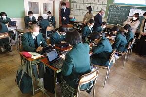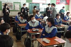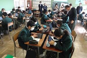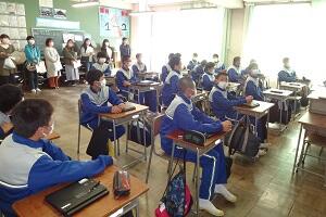 1年生が授業参観を行いました。新型コロナウイルスの関係で1年半の間授業参観が実施できませんでしたが、感染状況が落ち着いたことから今回実施することとしました。しかし油断をするわけにはいきませんので、クラスを半分に分けて異なる授業を同時展開しました。1つの授業は半分の時間でしたが密を避ける形で授業参観を行うことができました。その後生徒と保護者の方で一緒に、総合教育センターから講師の方をお招きして情報モラルについて研修をしました。