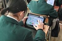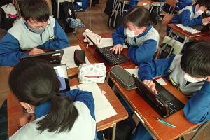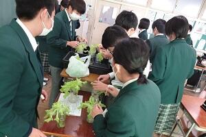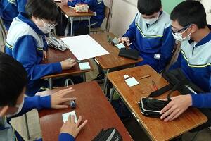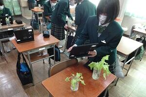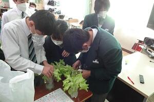 2年生では技術で栽培の授業をやっています。サニーレタスをペットボトルを使って水耕栽培していました。今日はその収穫とまとめをしていました。タブレットを使って栽培してきた写真とその様子や感想などを書き込んでいました。