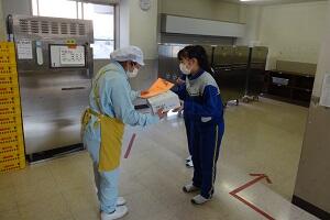 給食週間の中日の今日、給食配膳員さんに感謝する会が行われました。給食後の各クラスの片付けが終わった後、1階の配膳室で給食委員の代表が感謝の言葉を述べ、記念品を手渡しました。