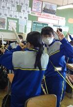 3年生が授業で使い終わった竹刀を持ち帰る準備をしていました。自転車で持ち帰るのに危なくないように、スズランテープで忍者のように背負って帰ります。この格好は慣れているので恥ずかしくありません。それよりも安全が第一です。