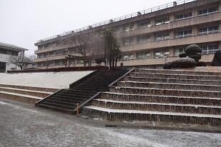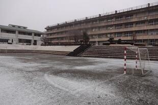 5時ころから雨が降り始め、6時半ころには雪が交じり、生徒が登校する頃には雪に変わっていました。あいさつ坂は生徒の安全を考えて、若い先生方が7時ころには融雪剤をまきました。校庭は雪景色です。