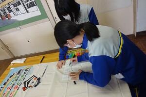 来年栃木県で開催される国体の応援の「のぼり旗」を3年生がデザインし、代表の生徒がマジックを使って制作していました。1組が神奈川県、2組が新潟県、そして3組が栃木県です。割り当てられた県の特徴を表すような絵を加えてきれいに仕上げてくれていました。
