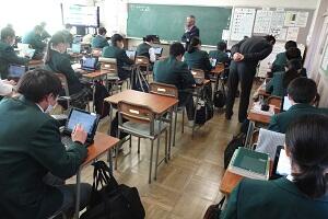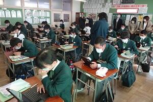 1年生が授業参観を行いました。新型コロナウイルスの関係で1年半の間授業参観が実施できませんでしたが、感染状況が落ち着いたことから今回実施することとしました。しかし油断をするわけにはいきませんので、クラスを半分に分けて異なる授業を同時展開しました。1つの授業は半分の時間でしたが密を避ける形で授業参観を行うことができました。その後生徒と保護者の方で一緒に、総合教育センターから講師の方をお招きして情報モラルについて研修をしました。