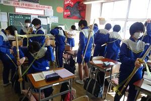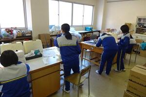 新型コロナウイルス感染症のオミクロン株の感染拡大を受け、教室内の換気は授業中も15㎝ほど窓を開けて、移動教室で空いた教室は窓全開で空気を入れ換えています。そして先週金曜日から体操着(ジャージ)での登校にしました。学校内での生活も一日を通して毎日洗濯のできる体操着です。家庭科は密を避けて準備室も使っていました。