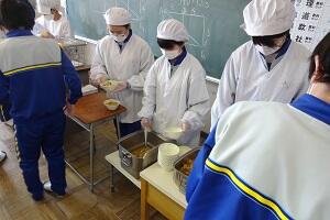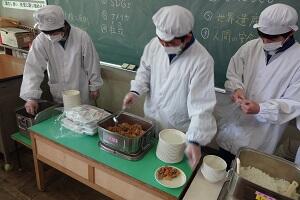 給食週間も5日目・最終日になりました。コロナの関係もあってすっかり給食当番の手袋と、配膳するときの消毒はあたりまえになりました。そして前向き給食も。