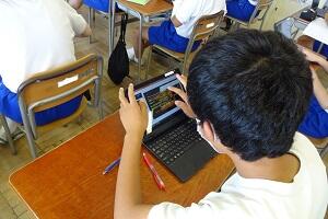 3年生は7月に延期になった修学旅行の準備です。時間に余裕ができましたので、タブレットを使ってゆっくり下調べができます。