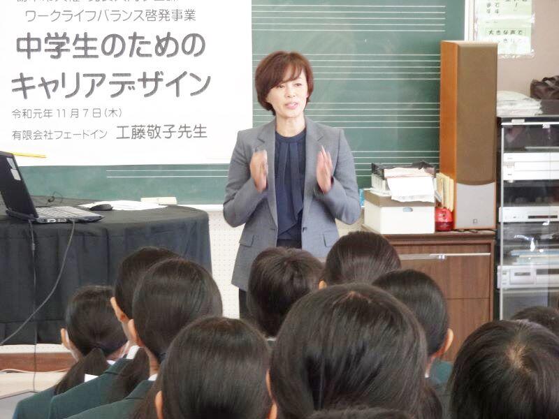 11月7日(木)、キャリア教育の一貫として、栃木県教育委員会教育委員の 工藤敬子 先生を講師にお招きして『中学生のためのキャリア・デザイン講座』を、1年生を対象に実施しました。「幸せな生き方・働き方をデザインするのはあなた自身」という工藤先生の言葉に、生徒からは「自分の頑張り次第で将来の幸せが決まると思いました。」「夢をあきらめようと思ったこともあったけど、今日の話を聞いて、また頑張ろうと思えました。」といった感想が聞かれました。