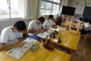 3年生は7月に延期になった修学旅行の準備です。時間に余裕ができましたので、タブレットを使ってゆっくり下調べができます。