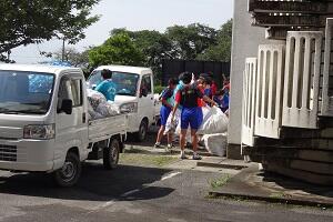 期末テストが終わり部活動再開。2週間後の夏の大会に向けてラストスパートです。でもその前に、明日生徒会がリサイクル活動を行います。そのための準備として新聞、雑誌、段ボール等を3階のリサイクル室から西昇降口に運び出しました。今日は野球、ハンド、邦楽、バド、文化と生徒会の皆さんでした。明日も部活動の生徒に手伝ってもらい、いぶき館にあるアルミ缶も加えてトラックに積み込みます。