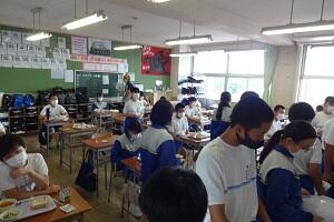 未だ収束が見えてこない、新型コロナウイルス感染症の予防対策をしての配膳の様子です。給食当番が手袋をしているのはもちろん、自分の給食を取りに来る生徒は、等間隔で廊下に並び、係から手のひらに消毒液をかけてもらってから配膳された給食を受け取ります。食中毒等の衛生面のことを考えたら、手袋や消毒はこのまま続けていった方がいいのでしょう。しかし、全員が前向きで、誰とも話さず静かに給食を食べるのは、早く終わりにしたいですね。生徒は「いただきます」をしてからマスクを取って静かに食べ始めます。