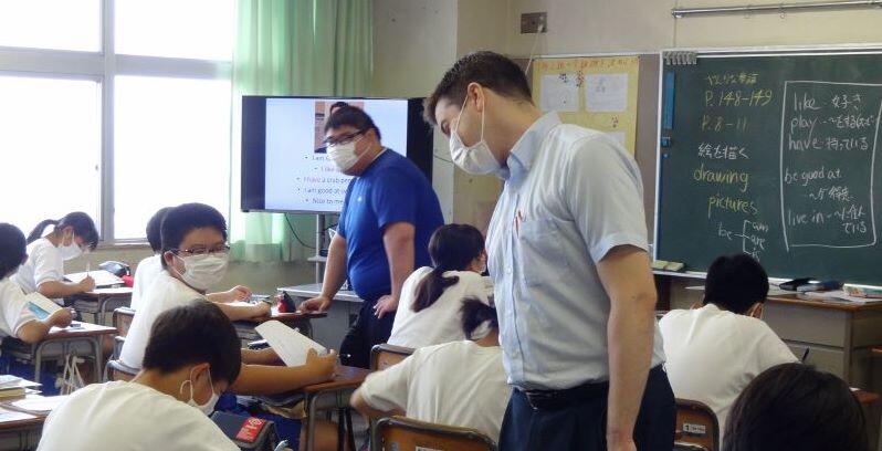 1年生の英語の授業。ALTの先生ももちろんマスク着用です。