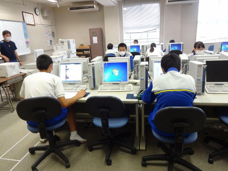 密を避け、半分の生徒はパソコン室で対面をさけて、もう半分の生徒は教室で間隔をとって、それぞれの課題に取り組んでいます。