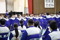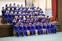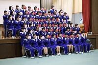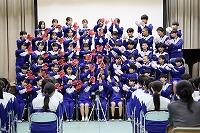 1年生は、昼休みを使ってずっと練習してきたハンドダンスを披露しました。手のひらを赤く染めて、手の甲を見せると白になるようにした手袋をした1年生が舞台に並び、音楽に合わせて手を表裏にしたり、紅白を使ってモザイク模様や文字を作ったり、ウェーブをしたりして表現をしました。2年生は、3年生の思い出を再現した動画を作成して上映。3年生は、当時を思い出したり、演技の面白さから笑ったりしながら、鑑賞していました。ビデオ上映後に、2学年全員での合唱「心の中にきらめいて」を披露しました。体育館にハーモニーが響き渡る感動的な合唱でした。