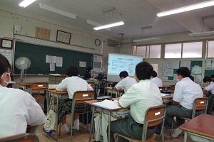 今年度も新型コロナウイルス感染症感染予防の観点から職場体験学習を実施しないこととしました。本来ならば実際に職場に赴き体験する中で、職業について考える機会をもたせたいところですが、生徒の安全、職場の方の安全を第一に考えたときに、職場にお伺いすることはリスクが大きいと判断しました。そこで、職場体験学習に代わるものとして今回の職業学習を行うこととしました。様々な職種の方をお招きして仕事の内容や必要な資格や道筋、苦労話などをお聴きします。看護師、獣医師、幼稚園教諭、スポーツ店経営者、銀行員、美容師、図書館職員の7種の職業の中から興味のある3種について講座形式で聴きました。職業を選択する際の一助になればと考えています。