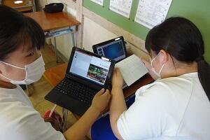 3年生は7月に延期になった修学旅行の準備です。時間に余裕ができましたので、タブレットを使ってゆっくり下調べができます。
