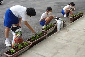 令和4年度のいちご一会栃木国体 栃木大会の開催に向けてプランターでの試行栽培を行っています。育苗ポットからプランターへの植え替えを行い、9月いっぱい学校で育てます。プランターにはアスリートへのメッセージを書いたシールを貼りました。10月になったら栃木市総合運動公園に飾られる予定です。
