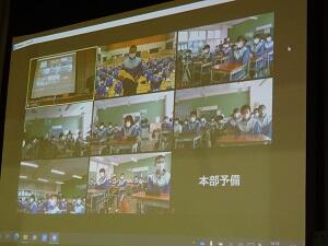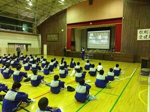 新入生歓迎会をリモートで行いました。1年生は体育館で、2、3年生は教室で生徒会長あいさつと新入生代表のことばを視聴しました。その後1年生は学校紹介と部活動説明会を、事前に撮影したビデオで視聴しました。学校紹介は生徒会役員が、部活動説明は各部の部長が工夫して撮影した映像で紹介しました。1年生はこの説明をもとに検討して3年間活動する部活動を決定します。今週は体験期間、来週が仮入部期間で4月26日(月)から正式入部になります。