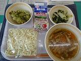 <今日の給食> きつねうどん・牛乳・ちくわの新緑揚げ・ほうれん草の梅鰹和え・米粉のりんごタルト