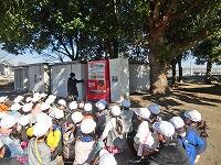 運動公園に着くと、自動販売機がありました。「地震が起きたら、これも倒れてくるかもしれない。」という声があがりました。自動販売機から距離を取り、下敷きにならないように気をつけたいという気持ちをもつことができました。また、看板や標識なども確認をして、その場所の使用方法やルール、気をつけることなども確認し、自分の命を守るためにどうしたら良いかを学習することができました。