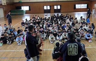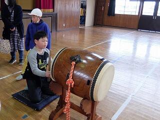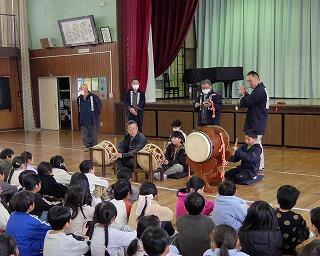 本日のロング昼休みは、野中町お囃子保存会のご協力で、体育館でミニ発表会を開催しました。お囃子の軽やかな音色が体育館内に響きました。野中町の児童も演奏に参加しました。休み時間で外遊びのできる時間にも関わらず、多くの児童が体育館に集まり、伝統的なお囃子の音に耳を澄まして聴いていました。最後に希望者に太鼓をたたく体験の機会を与えてくれました。交代しながら太鼓の演奏体験に取り組んでいました。