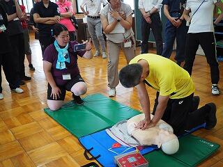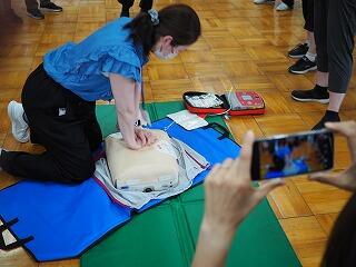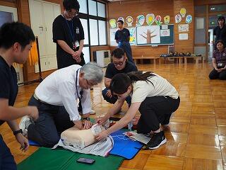 心臓マッサージとAEDをしています チーム一丸で交代して心臓マッサージを続けています。