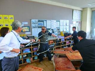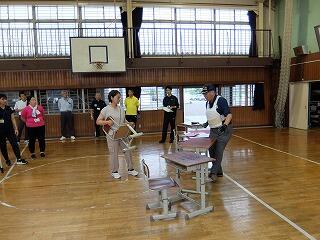 複数人で対応する訓練 児童用椅子で身を守る訓練