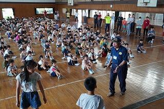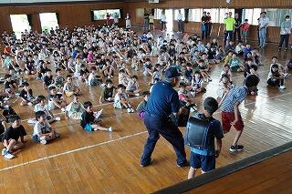 本日不審者侵入対応避難訓練を実施しました。4年2組の教室に不審者が侵入したという想定で、全児童が体育館に避難をしました。教職員は不審者に対応するもの、児童の誘導を行うもの、避難経路の安全を確保するもの等の役割に分かれて、児童の安全確保を図りました。栃木警察署スクールサポーターの方と吹上駐在所の警察官の方が、訓練に参加し指導をしていただきました。その様子を紹介します。